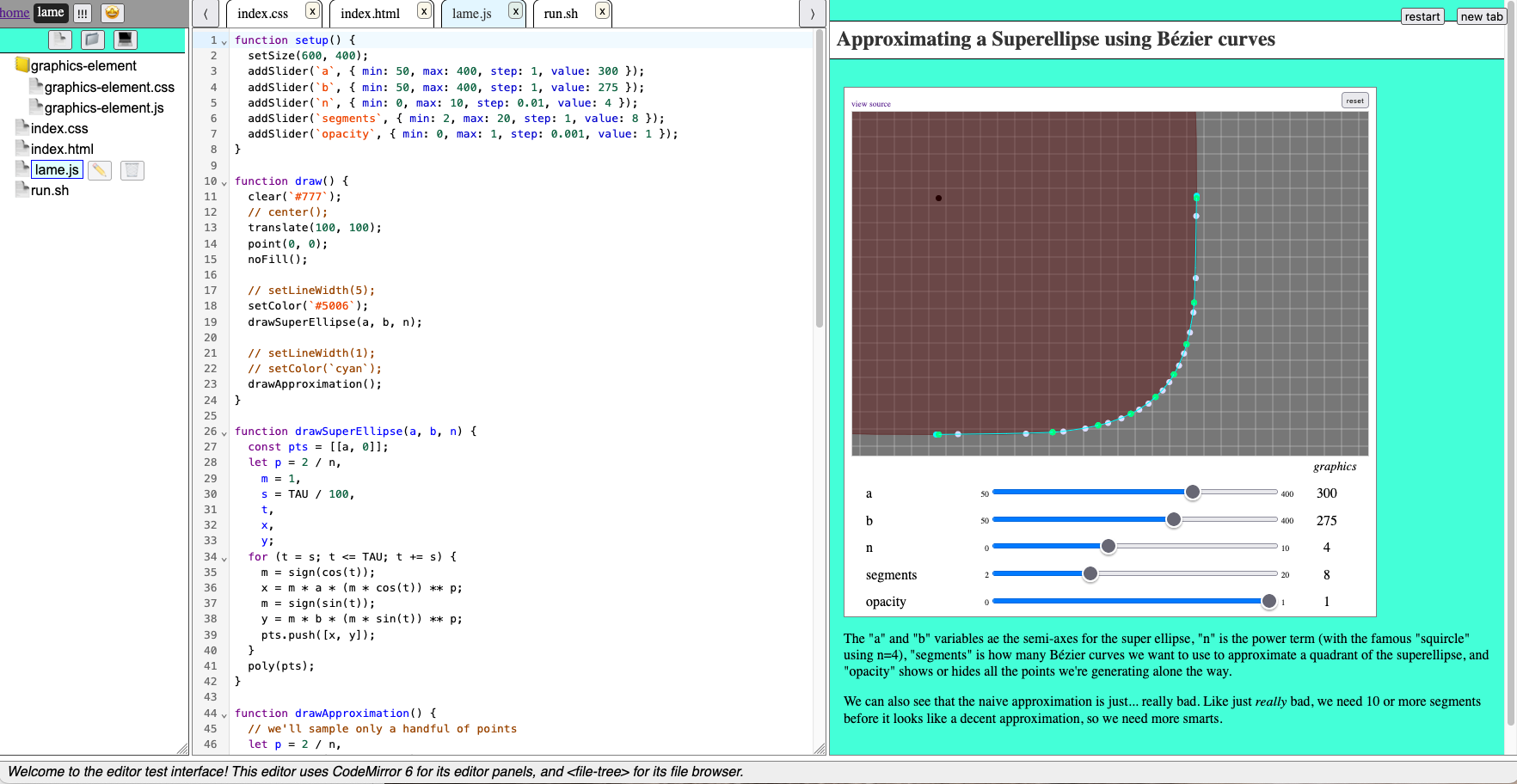 This instance comes with a bunch of starter projects that you can remix so you don't have to start from scratch, including a basic "single page" HTML/CSS/JS website, a Node.js site that uses Express to run a simple webserver, and even a web graphics demo that lets you write interactive graphics code in JS: